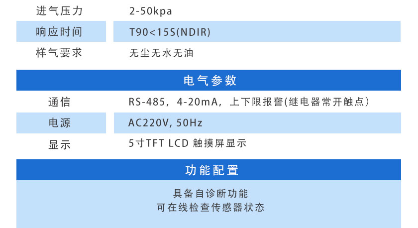 CO:0-2000ppm,CO2:0-50% ,CH4:0-100%,H2:0-1000ppm,O2:0-25%,H2S:0-9999ppm (量程可根據用戶實際需求配置) |