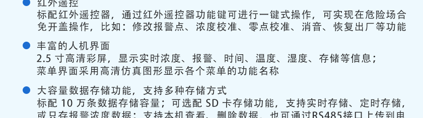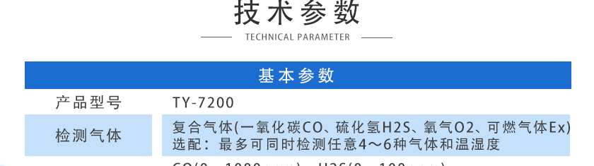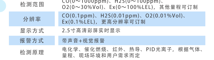 CO(0~1000ppm)、H2S(0~100ppm)、O2(0~30%Vol)、Ex(0~100%LEL),其他量程可訂制 |