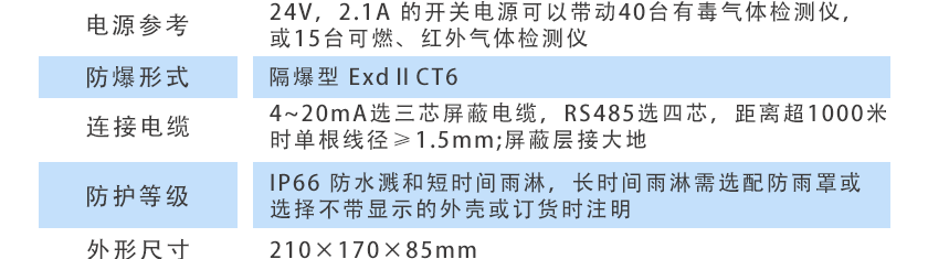 24V,2.1A 的開關(guān)電源可以帶動(dòng)40臺(tái)有毒氣體檢測(cè)儀,或15臺(tái)可燃、紅外氣體檢測(cè)儀 |