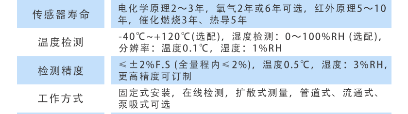 電化學(xué)原理2~3年,氧氣2年或6年可選,紅外原理5~10年,催化燃燒3年、熱導(dǎo)5年 |
