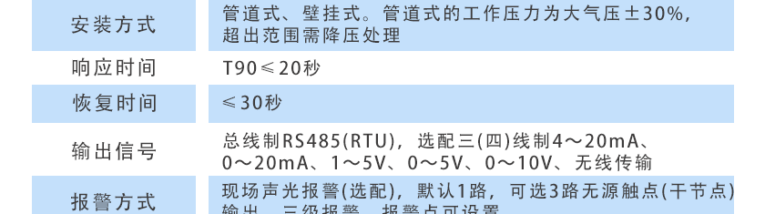 固定式安裝,在線檢測(cè),擴(kuò)散式測(cè)量,管道式、流通式、泵吸式可選 |