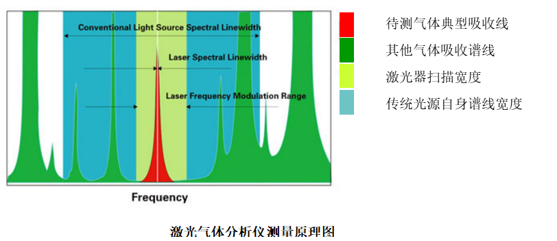2.4.2 優(yōu)點(diǎn)可調(diào)諧半導(dǎo)體激光光譜吸收技術(shù)TDLAS本質(zhì)上是一種光譜吸收技術(shù),通過(guò)分析激光被氣體分子的選擇性吸收來(lái)獲得氣體的濃度。它與傳統(tǒng)紅外光譜吸收技術(shù)的不同之處在于,半導(dǎo)體激光光譜寬度遠(yuǎn)小于氣體吸收譜線的展寬,如上圖。因此,半導(dǎo)體激光吸收光譜技術(shù)是一種高分辨率的光譜吸收技術(shù)。系統(tǒng)采用特定波長(zhǎng)的激光束穿過(guò)被測(cè)氣體,激光強(qiáng)度的衰減與氣體的濃度滿足朗伯.比爾定理,因此可以通過(guò)檢測(cè)激光強(qiáng)度的衰減信息分析獲得被測(cè)氣體的濃度。采用半導(dǎo)體激光吸收光譜技術(shù)的激光氣體分析儀可從原理上抗背景氣體的干擾,測(cè)量結(jié)果可靠性高。
